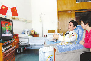 照片:十七大代表方永刚正在病房收看党的十七大开幕式。钟魁润摄
