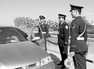 照片:城市巡逻分队正在对社会车辆进行安全检查。曹侨伶摄