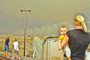 10月24日,在美国加利福尼亚州,一名妇女抱着孩子眺望远处冒起的浓烟。从21日起,10余起山林大火肆虐加州南部,已造成数十人伤亡,财产损失超过10亿美元。 新华社/法新