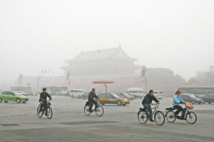 10月26日,北京地区出现浓雾,能见度不足百米。图为市民在雾中的长安街上骑车。 陈晓根摄