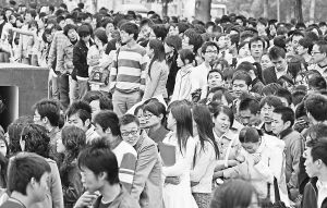 照片:10月28日,湖北武汉。在华中科技大学光谷体育馆举行的一场面对大学毕业生的免费招聘会上,主办方为了安全和秩序控制学生进场的流量,而大量场外的学生想尽办法进入招聘会场。远征摄