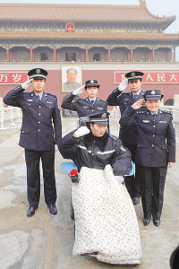 11月7日上午,缉毒英雄罗金勇及妻子罗映珍(右一)与天安门分局民警一同来到天安门广场,向国旗敬礼。天安门分局民警6月20日在北京宣武医院探望缉毒英雄罗金勇时“相约国旗”的约定终于实现。