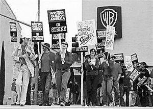 美国编剧大罢工。剧作家工会日前表示,经过冗长的协商,与美国“电影暨电视制作联盟”间的提高稿酬谈判已经宣告破裂,因此10月份的“劳动契约”到期后,编剧们纷纷罢写。媒体称,此次编剧大罢工引起的“剧本荒”将波及整个好莱坞、华尔街并进入每个美国家庭的客厅。黄金档时间可能将被重播节目和不需要编剧的真人秀节目占据。