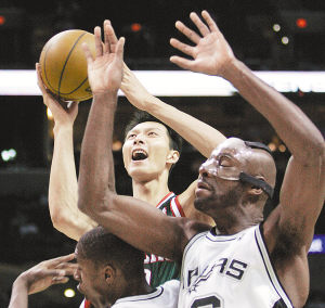 照片:11月12日,雄鹿队在客场以88∶113不敌马刺队。图为易建联突破上篮。埃易摄