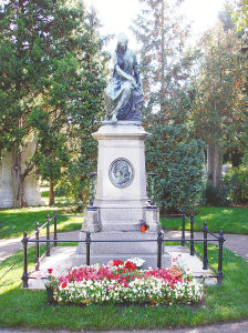 站在莫扎特墓前的感觉,正像他创作的协奏曲一样,平静舒适。虽然这只是莫扎特的衣冠冢,他的遗骨被埋葬在维也纳另一个普通公墓——圣马克公墓,但怀抱竖琴坐在书本上的音乐女神雕塑,却简单而平实地诠释了音乐家躯体的消逝并不意味着精神财富的消失。