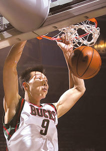 图:11月15日,雄鹿队在主场以102∶99战胜灰熊队。图为易建联在比赛中扣篮。加里摄