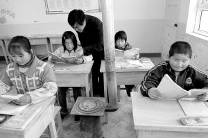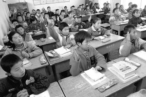 甘肃省定西市安定区营坊小学五年级学生在上自习课(上图)。营坊小学的5个班中,不足5名学生的“麻雀班”就有3个,而距离营坊小学约1公里的花沟学校平均每个班有51名学生,人数最多的班有74人(下图)。