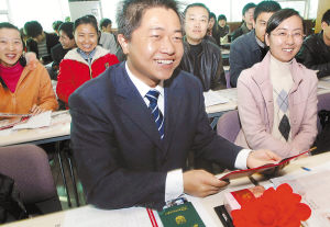 11月19日,被聘任为银川市兴庆区通贵乡司家桥村村委会主任助理的大学生靳宁(前左)在派遣欢送会上发言。当日,经过层层选拔的宁夏首批44名大学生村干部分赴银川市兴庆区所属的39个村、5个科技示范园区,进行为期两年的工作实践。