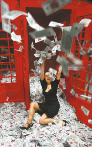 11月22日,在莫斯科举行的2007百万富翁展销会上,一名模特向天空抛洒道具钞票。这个以富豪为对象的展销会于当天开幕,展出的都是全世界最奢华昂贵的物品。新华社/法新