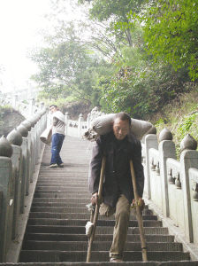 每天,这个截去了半条右腿的中年汉子,都要拄着双拐,扛起30斤重的沙袋,在风景优美的武当山上,用左腿上下往返走8万余级台阶。这并非一位独腿的武林高手在武当山健步如飞,而只是一个残疾劳工在赚取一点微薄的酬劳。