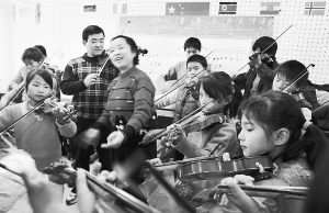 11月26日,北京光爱学校的流浪儿童在中央音乐学院教授赵薇的指导下,排练小提琴合奏。当天,中外志愿者们来到学校看望孩子,他们还用纯正的英语教授同学共唱英文歌。光爱学校由现任校长石青华2004年创立,目前收留了全国各地100多名流浪儿、孤残儿和特困儿,孩子在这里不仅得到生活上的照顾,而且可以接受不同层次的文化教育。本报记者郑萍萍摄