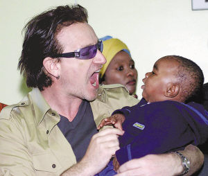 ▲2002年5月24日,爱尔兰摇滚乐队U2主唱博诺在南非索韦托一家医院的艾滋病房怀抱一名11个月大的艾滋病患儿。
