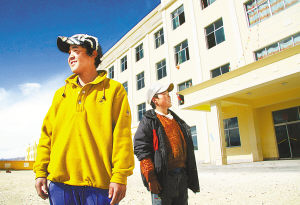 12月3日,藏族学生在昂仁县中学新建教学楼前。近日,位于冈底斯山脉中部的西藏昂仁县中学的师生们有了一处崭新的校园。由国家投资3000多万元修建的综合教学楼、学生宿舍楼、教工宿舍楼和餐厅等建成并投入使用。该校2921名中学生也从去年的四个分散教学点集中到新校园学习。