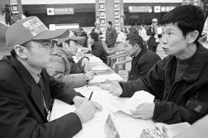 12月4日,北京火车站,来自中国政法大学的法律硕士赵敏杰(左)正在听一位农民工朋友反映情况。