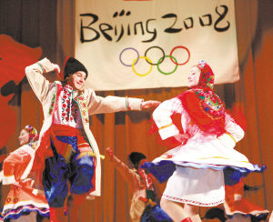 乌克兰学生11日在基辅举行的春节晚会上跳起欢快的民族舞蹈。当天,中国留学生2008年春节联欢晚会在乌克兰国立技术大学礼堂内举行。中国留学生、乌克兰十多所高校的领导和中国驻乌使馆人员、中资机构代表等600多人参加了晚会。新华社记者宋宗利摄