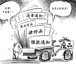 北京密云县太师屯镇,数百封未拆封的邮件从居委会被卖到了废品站,其中大多是中国移动、银行和交通局的催款信件。漫画:徐简