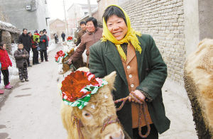 1月25日,河南濮阳坝头村农民喜滋滋地牵着县里送的“扶贫牛”回家。当日,河南濮阳坝头村24户贫困农民分别获得了县里送的特别的年货——一头母牛。到目前为止,该县通过实施“扶贫牛”项目,向贫困户送母牛,已经帮助84户贫困户脱了贫。毕海滨摄(新华社发)