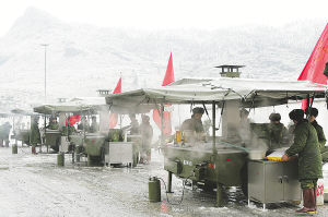 在韶关龙归镇,某部组织了几十台野战炊事车现场给滞留司机和旅客烧水做饭。人少任务重,有的炊事员一天要煮40多次饭。某部炊事班长李琼,几天几夜没合眼,困了在额头上抹一把雪,脚冻僵了仍然不换班。他说,我现在心里只有一个念头,就是多做饭多做饭,尽量多让一个群众吃到我做的饭。该部后勤部部长聂荣峰告诉笔者,他们携带了一万公斤主食,一万公斤副食,每台炊事车通宵作业,每半小时送出500人的饭菜。但为了多给群众一个馒头,很多官兵都自觉省下自己的口粮。炊事员曹广科蒸馒头包子一万多个,煮稀饭60多锅,但自己却只吃了两顿饭。炊事班长曾明云,妻子小孩刚来部队探亲,原本安排留守,但部队出发时他又悄悄上了车。他边指挥边动手,几天几夜没合眼。为了使自己不打瞌睡,他每隔半小时就往自己嘴里塞一块生姜。