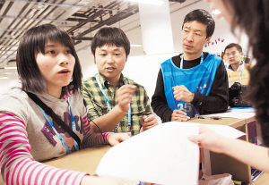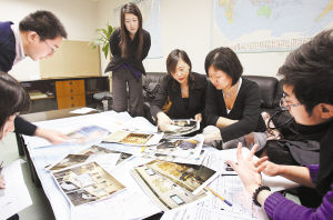 2月2日,摄影运营官赵迎新(中)带领团队与设计方——北京建筑设计院人员商讨主新闻中心摄影服务区的硬件细节。