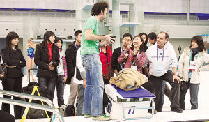 1月29日,摄影经理们同盖蒂图片社摄影师亚当(台上)、奥运会摄影服务专家皮特(右二)在泳池边进行交流。