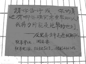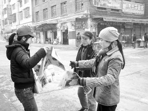 1月中旬以来,凝冻天气袭击贵州省龙里县,该县路冻、路滑现象严重,广大群众出行不便。为此,团龙里县委等发起青年志愿扶助行动,发动广大青年尽己所能向需要帮助的人伸出援手。志愿扶助队成立后,志愿者各司其职,立即开展行动。他们在街上散发灾情通报;为车站滞留旅客送药品、食物;在农贸市场了解物价情况,举报哄抬价格的不法商贩。2月1日以来,志愿扶助队共走访帮助20余户弱势群体家庭,送去了150余块蜂窝煤,100余斤面条,40斤菜油,20床棉絮、15床毛毯、12床被子。还有10名志愿者为6户孤寡老人每天挑水2桶。刘万千摄
