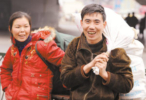 照片:2月9日,在贵阳市客运站,在贵州老家过春节的吴宗发(右)准备乘车前往浙江去打工。新华社记者杨俊江摄