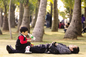 2月9日,深圳市一公园,小朋友正坐在熟睡的父亲腿上喝水。当天,深圳经过数日阴霾后,迎来了难得的大晴天,不少市民纷纷走到室外,享受阳光的温暖。