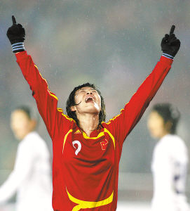 2月18日晚,东亚四强赛女子足球中国队对韩国队的比赛在重庆永川体育场举行,中国队以3∶2战胜韩国队。这是上半场结束前中国队前锋韩端在禁区内抢点得手后仰天长啸。 本报记者 刘占坤摄