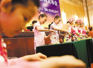 照片:来自北京东城区少年宫的学生,在新闻发布会上表演茶艺。本报记者 郑萍萍摄