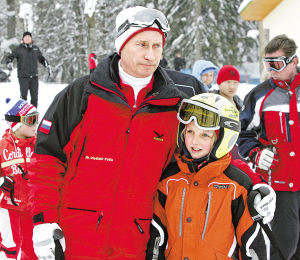 2月23日,俄罗斯总统普京(左)在索契滑雪胜地红波利亚纳滑雪时与一个小女孩合影。新华社/法新