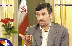 2月23日伊朗总统马哈茂德·艾哈迈迪-内贾德在德黑兰接受电视台采访的电视画面。艾哈迈迪-内贾德当日在接受国家电视台采访时要求美国及其盟国就指控伊朗寻求发展核武器问题道歉。新华社/法新