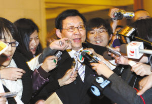 ▲步入人民大会堂的商务部部长陈德铭回答记者提问。