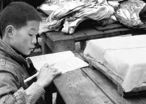 2月28日,贵州麻江县柏秧平村一名留守小学生一边做作业一边卖豆腐。随着农村外出务工农民增多,一些农村留守孩子和老人成了家里的顶梁柱。这一现象越来越成为各级政府关注的问题。 姜泽鹏摄