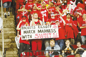 照片:3月6日,NBA常规赛,火箭主场大胜步行者,现场球迷打出了庆祝火箭16连胜的标语。 比尔摄