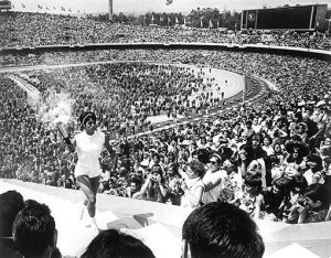 第十九届奥运会于1968年10月12日在墨西哥开幕。这一天是哥伦布发现新大陆476周年纪念日。作为著名航海家的后裔,墨西哥20岁的女田径选手诺玛·恩里克塔·巴西利奥·德索克罗高举火炬绕场一周,当她登上90级台阶点燃火焰,这时全场8万多观众响起了热烈的掌声和欢呼声。巴西利奥成为奥运会史上第一个点燃奥林匹克圣火的女性。本报记者张璋整理