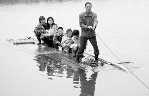 教师用摆渡船接送小学生上学