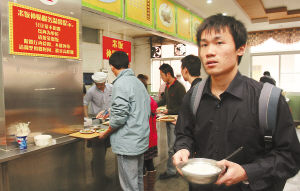 3月28日,一名学生在厦门大学芙蓉餐厅领取免费米饭。当日开始,厦门大学实行新的伙食补贴政策,通过划拨的专项伙食补贴向在校学生免费提供米饭,惠及全校3.6万多名学生。为防止浪费,厦门大学要求学生注意节约,按需取用。新华社发