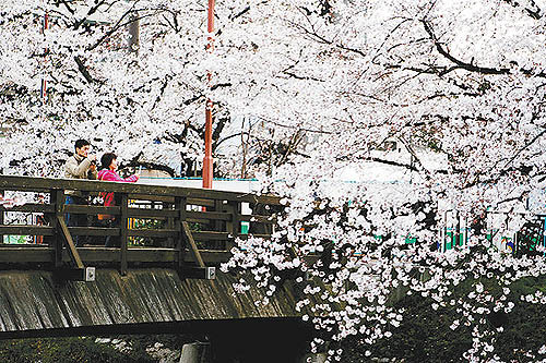 东京也有很多欣赏樱花的好去处。上野公园自不待说,经过鲁迅先生的传介,这里已经成为国人熟知的赏樱名所。千鸟之渊是另一处景区,这里湖面静谧,波澜不惊,樱树就种在两岸的河堤上,遇到天晴时,碧水繁樱好不洒脱。作为世界最繁华的都市之一,东京的闹市区同样有樱花的存在,新宿御苑就以其充满现代化气息的背景,为传统、风雅的赏樱之举平添了新的情趣。