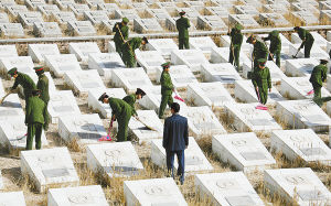 4月4日,清明节这天,解放军总后勤部青藏兵站部数千名官兵来到格尔木市烈士陵园扫墓,向革命先烈敬献鲜花。