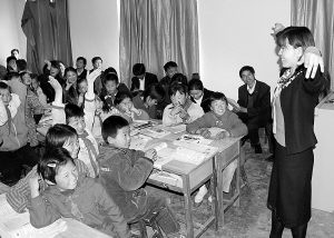 4月15日,山东省枣庄市台儿庄区实验小学教师王允在为土山小学的学生上课。当日,台儿庄区实验小学两名“教学能手”来到大山深处的山亭区土山小学,为学校师生送上两节示范优质课,让山里的教师和孩子足不出户就能体验到现代教学手段和新教学理念。 李宗宪摄