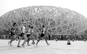 4月18日,运动员在比赛中。当日,“好运北京”国际田联竞走挑战赛男子20公里比赛在国家体育场——“鸟巢”进行。迎来首场比赛的“鸟巢”正式揭开美丽而神秘的面纱。