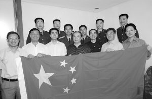 照片:2004年7月9日,一面崭新的五星红旗见证了中国驻伊拉克使馆正式复馆。前排中间为复馆小组组长孙必干,前排右一为蒋旭,后排是中国政府首次向国外派遣的外交护卫人员。蒋旭提供