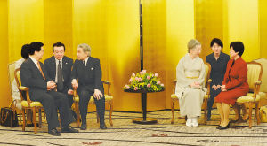 照片:5月9日,在国家主席胡锦涛即将离开东京前往外地继续对日本进行国事访问之时,日本明仁天皇和皇后专程来到胡锦涛下榻的饭店同胡锦涛和夫人刘永清亲切话别。新华社记者 李学仁摄