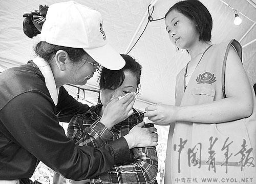 5月22日,什邡市洛水镇,来自台湾慈济基金会的一位志愿者(左)正在安慰在地震中失去女儿的母亲徐思蓉。