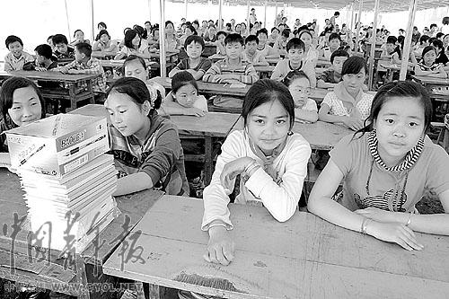 5月28日下午,在简短的升旗仪式后,绵阳市安县永河镇中心小学204名六年级学生在地震后首次返回学校上课,他们的教室是由广东边防总队七支队赴四川抗震救灾队援建的“帐篷学校”。本报记者 林洁摄