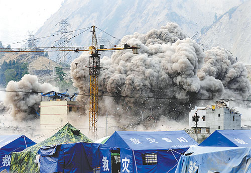 6月5日,汶川县映秀镇第一阶段地震危楼爆破继续进行。截至目前,已爆破作业危楼共计36栋,为灾后重建铺平道路。 新华社记者 李紫恒摄