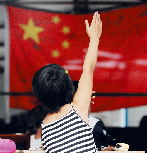 照片:6月6日,在映秀镇心连心小学,一个小女孩在上课时举手要求回答问题。新华社记者李尕摄