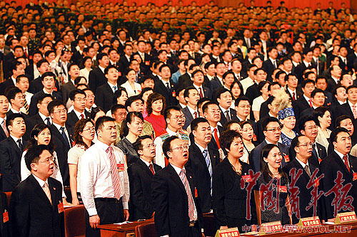 照片:6月10日上午,共青团第十六次全国代表大会在在北京人民大会堂开幕。大会开始,全体起立,唱国歌、团歌。本报记者 李建泉摄