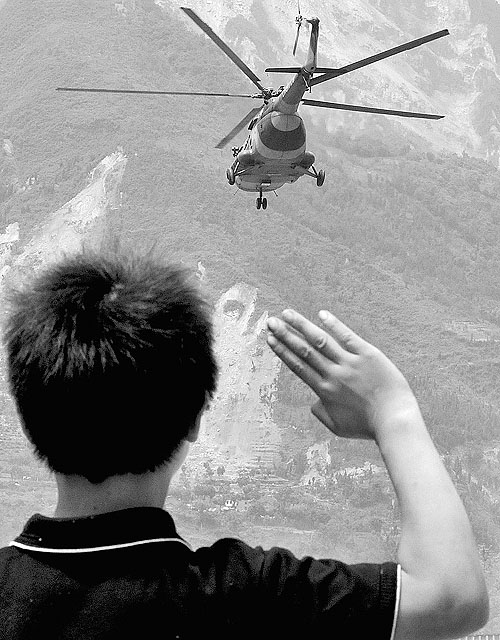 6月10日,在北川县擂鼓镇,一名少年向一架参加救灾的直升机敬礼。直升机为抗震救灾作出了突出贡献,赢得了灾区人民的崇敬。 新华社记者 杨俊江摄