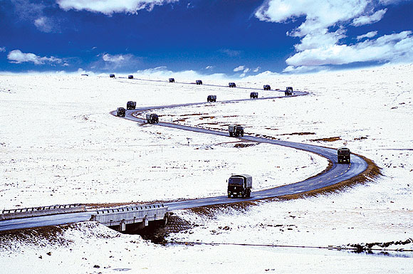 6月,海拔5231米的唐古拉山口仍然大雪纷飞。一辆辆被漆成橄榄绿的“北方奔驰”重型卡车,轰隆隆地从这里驶过,这是青藏兵站部的汽车部队,准备将一车车物资运往西藏的各个地区。